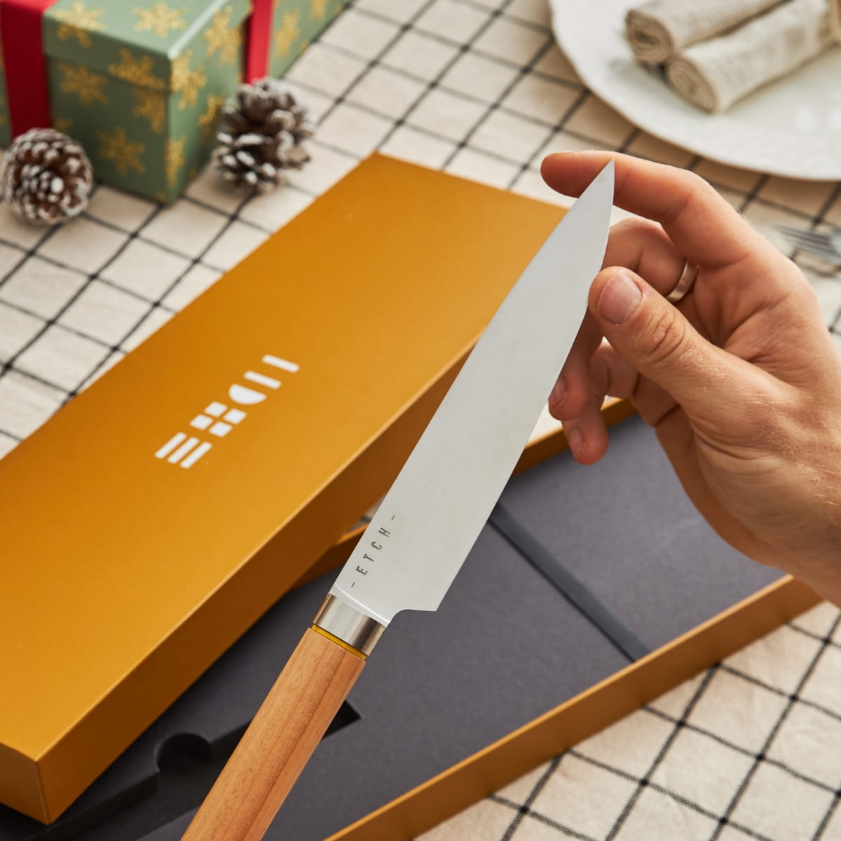 ETCH propose des couteaux de cuisine alliant l'élégance du design japonais épuré à la polyvalence française artisanale. Conçus à Paris et fabriqués à Thiers, capitale de la coutellerie, ces outils sont le fruit d'un savoir-faire transmis par des maîtres couteliers qualifiés depuis cinq générations. Dotés de lames en acier Nitrox inoxydable et de manches en bois de merisier ergonomiques, nos couteaux tranchants, résistants et confortables sont spécialement conçus pour les chefs exigeants et les passionnés de cuisine, pensés pour durer toute une vie.